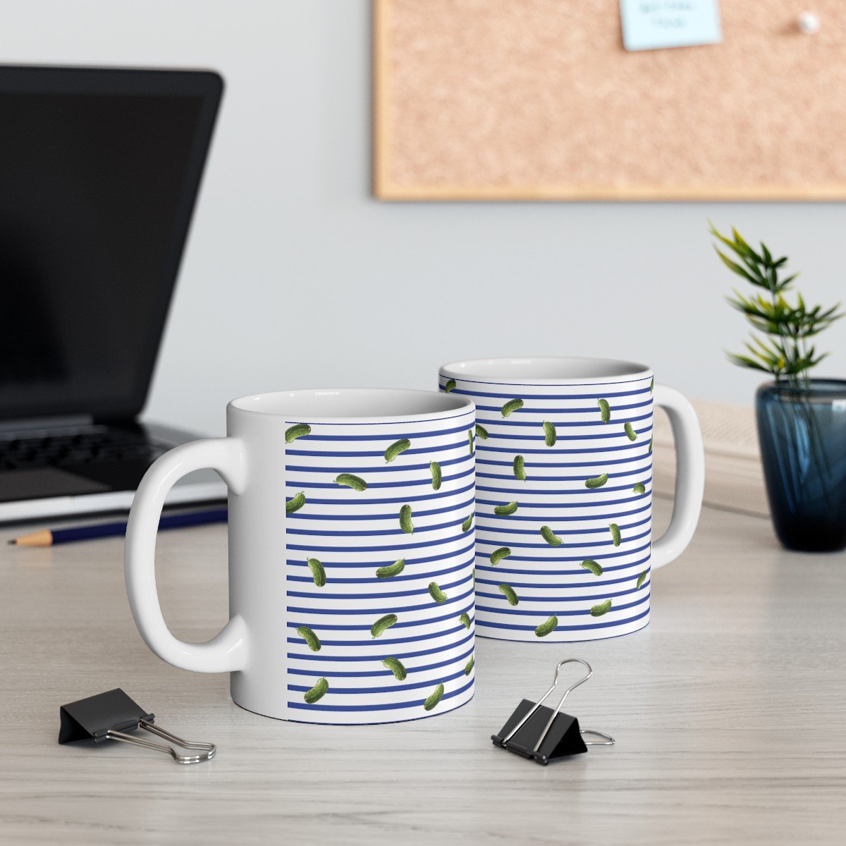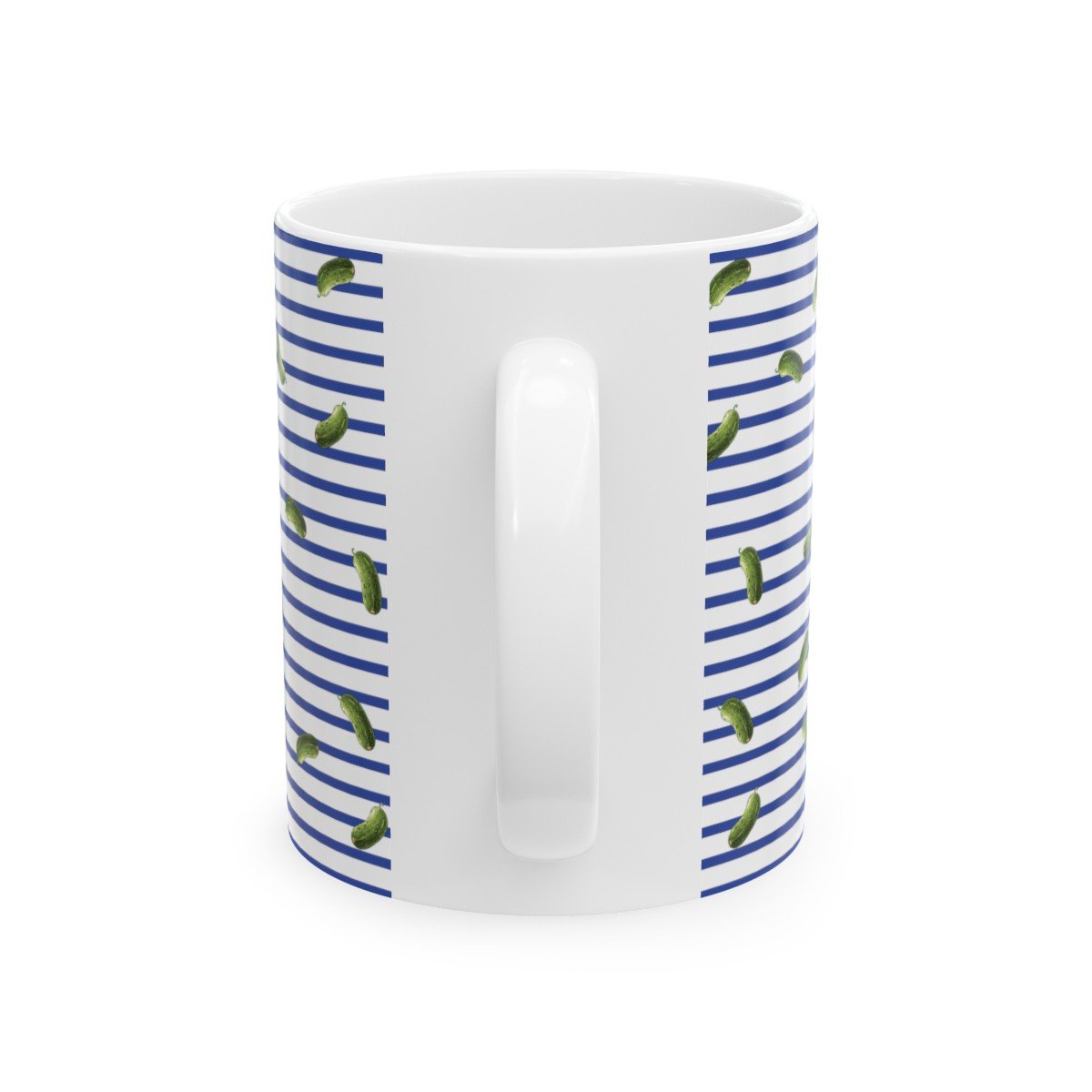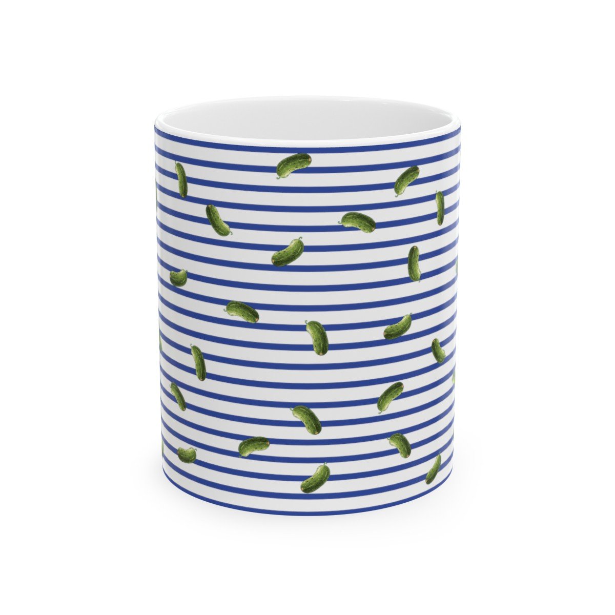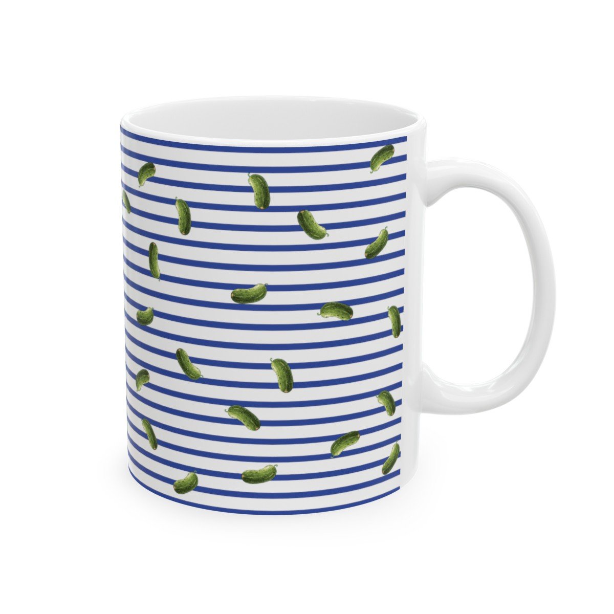 Blue and White Stripes With Green Pickles Design – 11 oz Coffee Cup Mug.