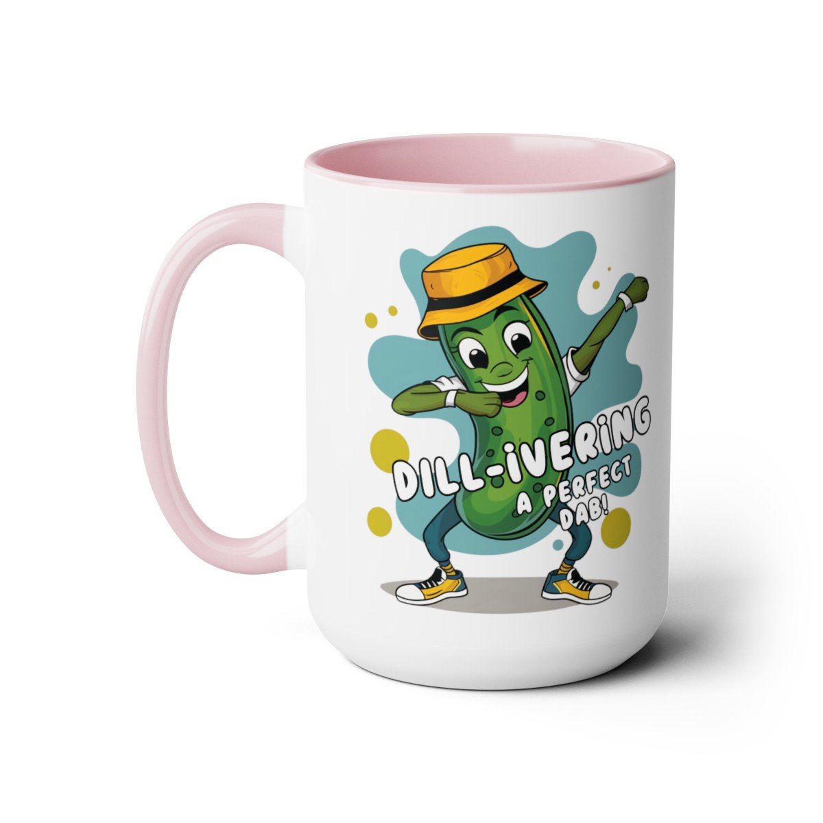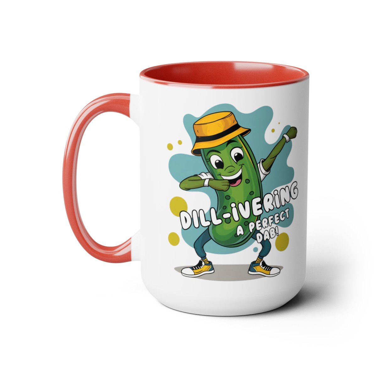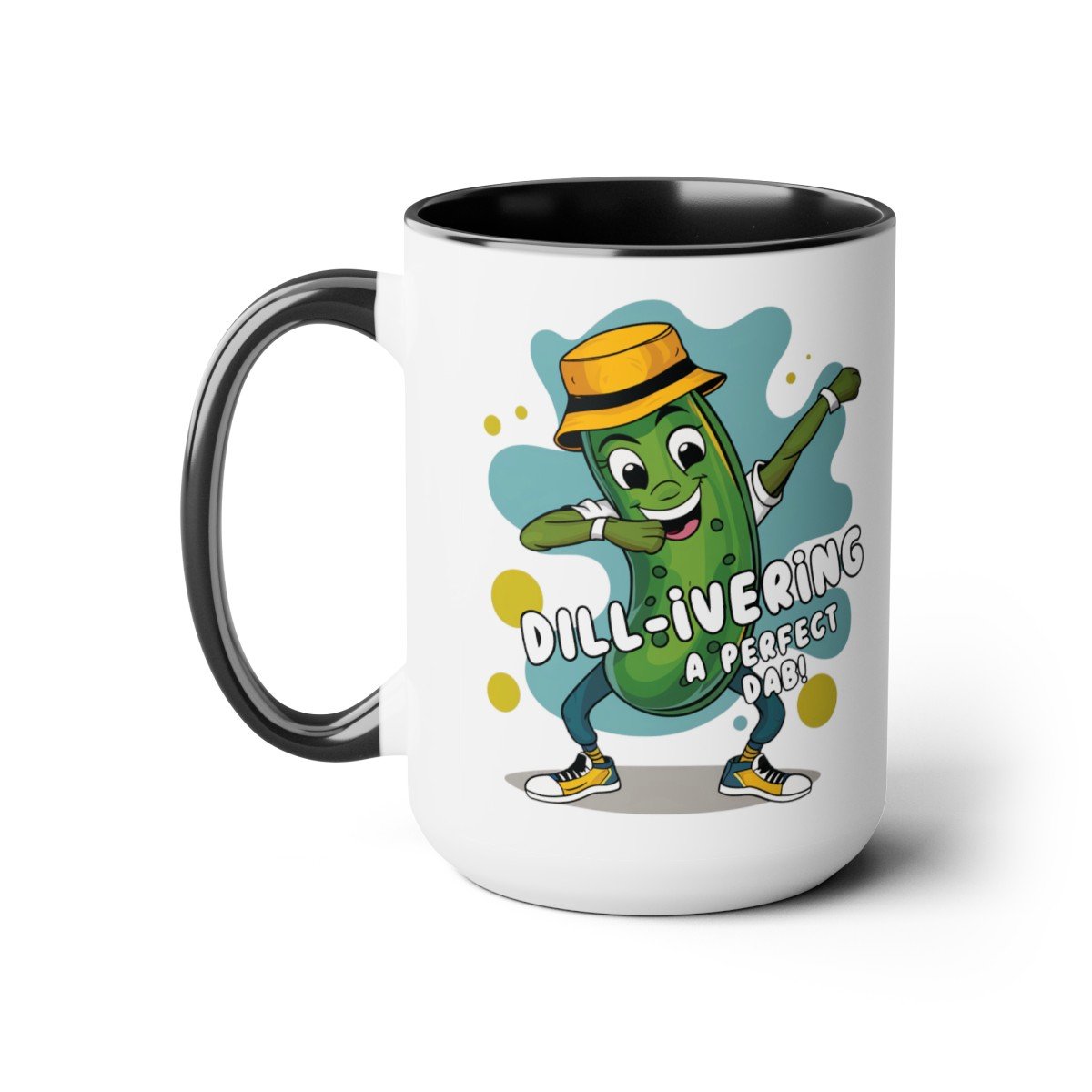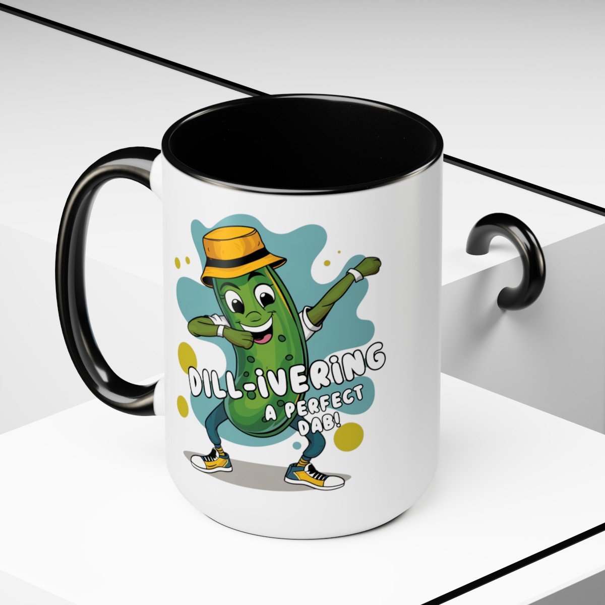 DILL-ivering A Perfect Dab – Dabbing Dance – Pickle Puns – Choice of Colors – Two-Tone Coffee Mugs, 15oz.