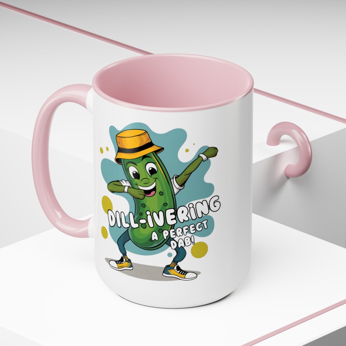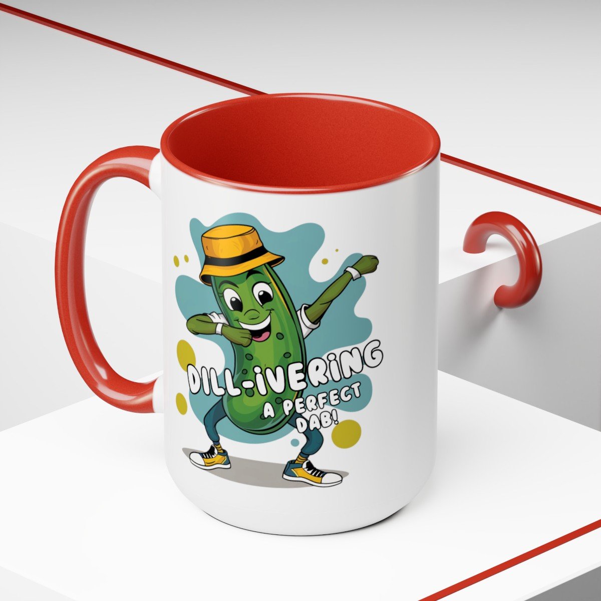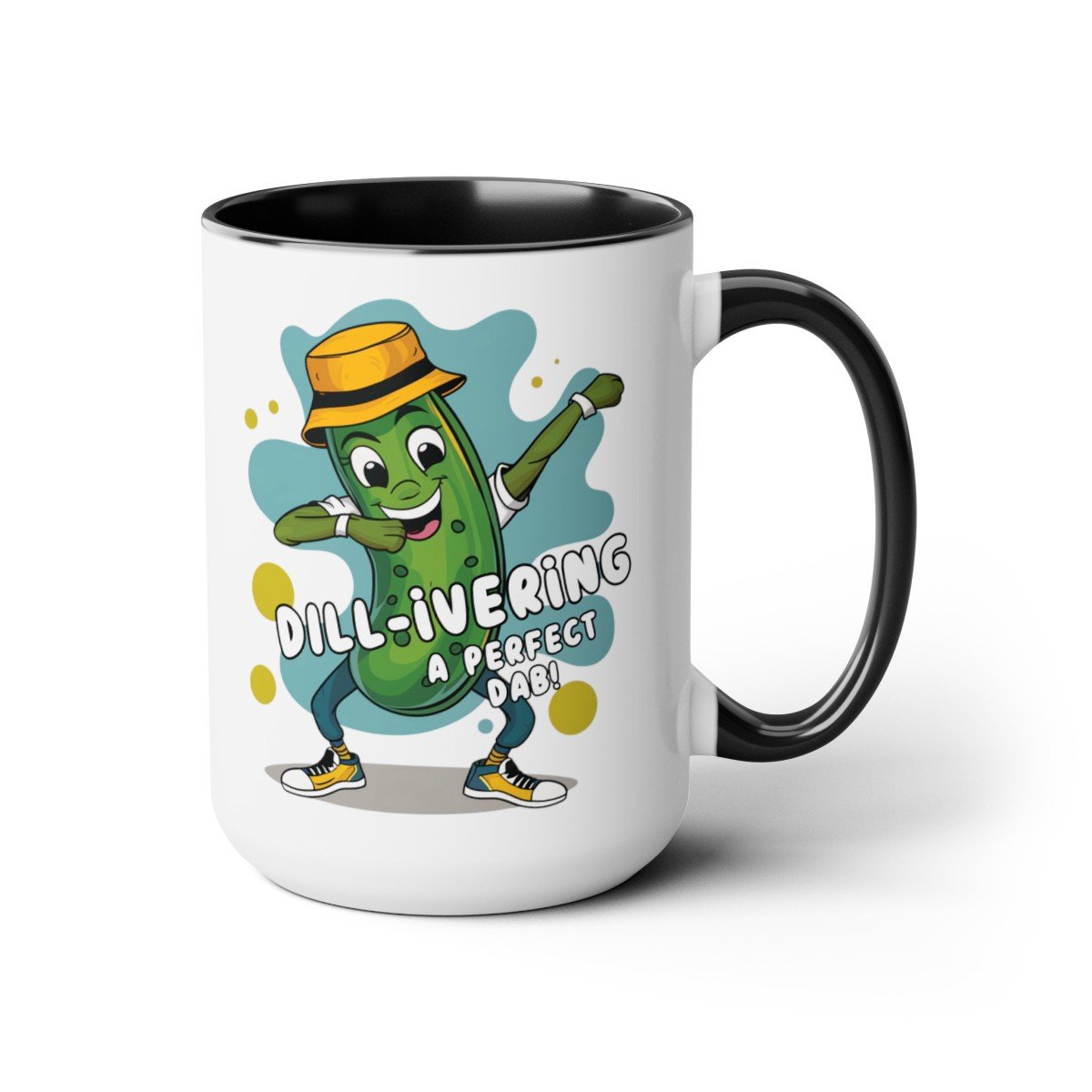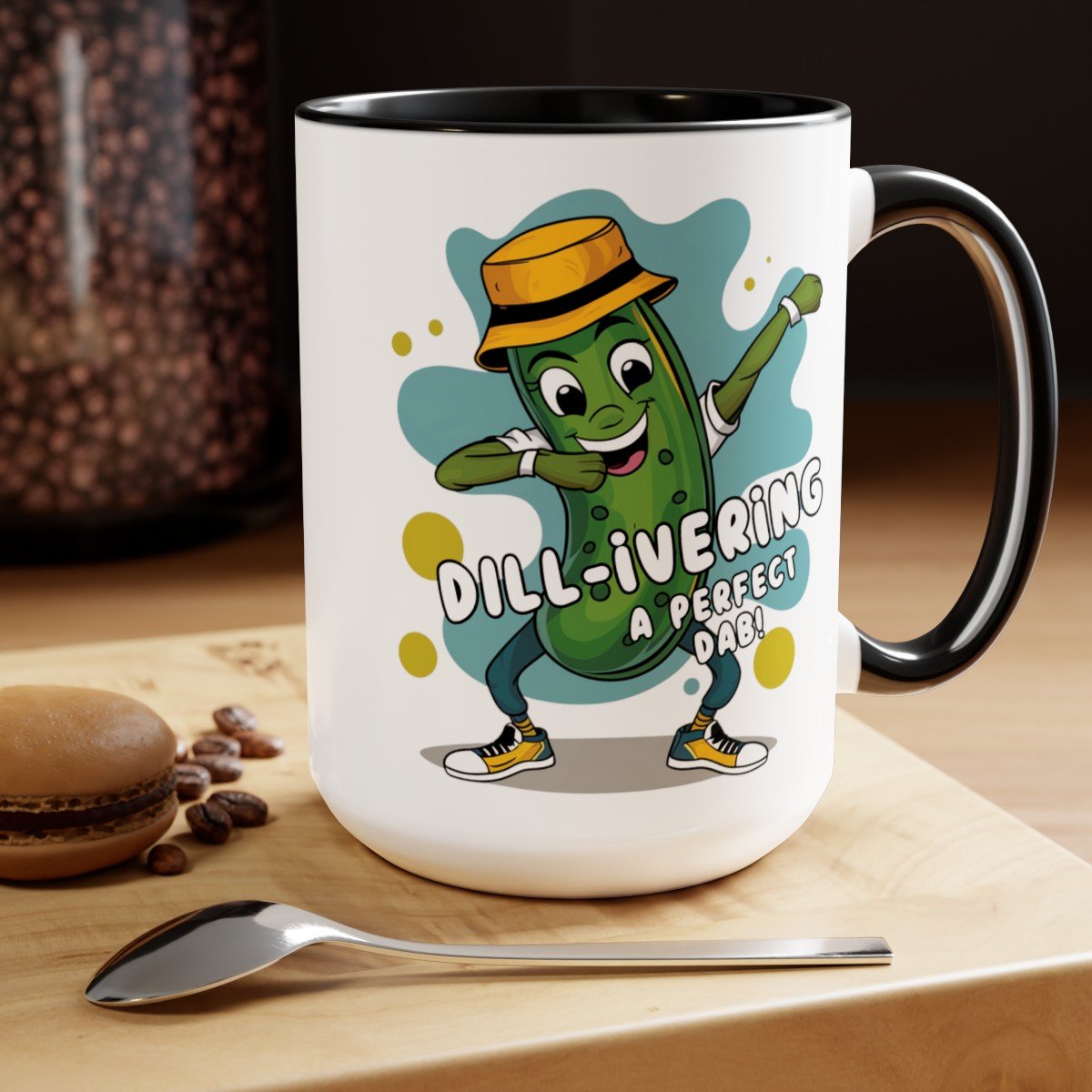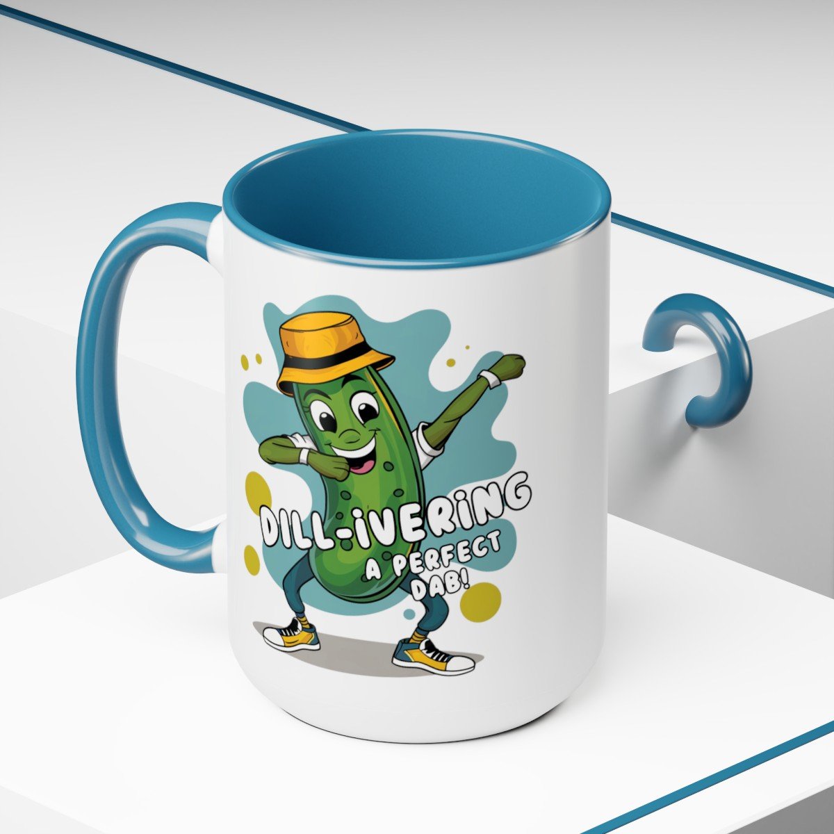 DILL-ivering A Perfect Dab – Dabbing Dance – Pickle Puns – Choice of Colors – Two-Tone Coffee Mugs, 15oz.