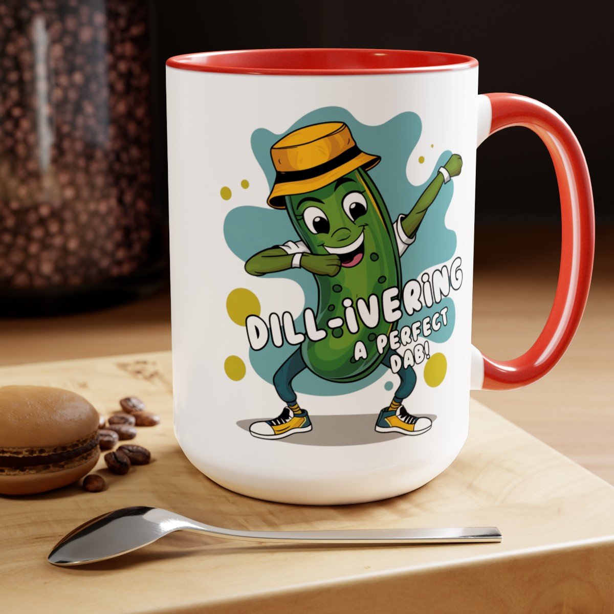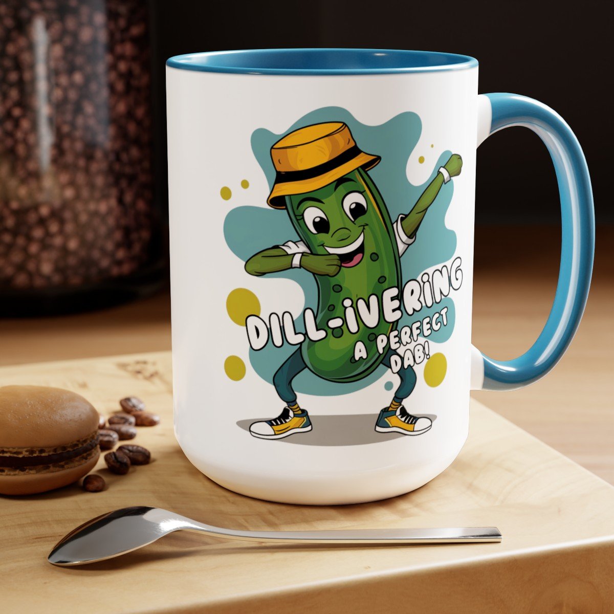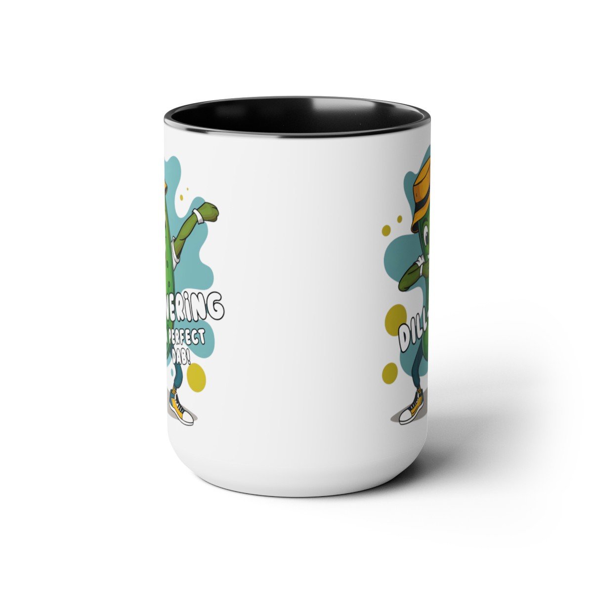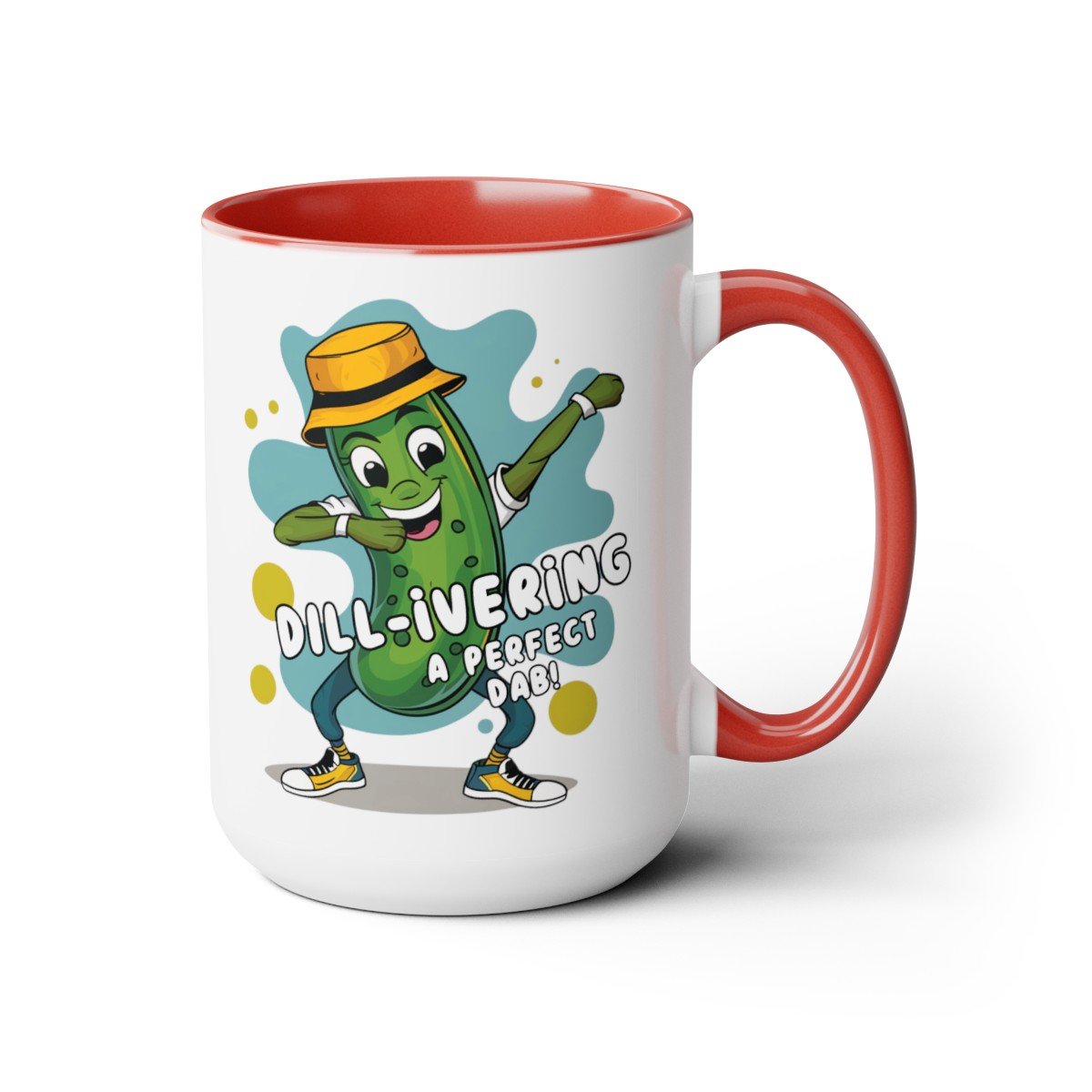 DILL-ivering A Perfect Dab – Dabbing Dance – Pickle Puns – Choice of Colors – Two-Tone Coffee Mugs, 15oz.